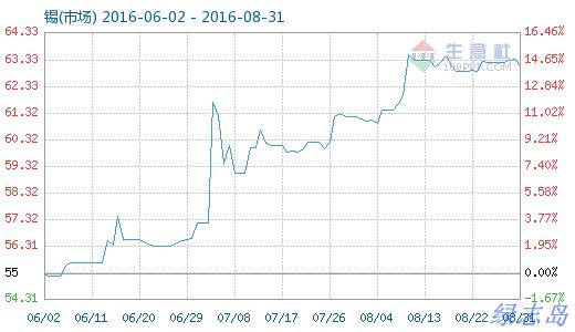 8月31日錫(市場)商品指數(shù)為63.11,較昨日下降了0.25點,較周期內(nèi)最高點100.25點(2011-09-05)下降了37.05%,較2015年12月09日最低點42.86點上漲了47.25%。(注:周期指2011-09-01至今)