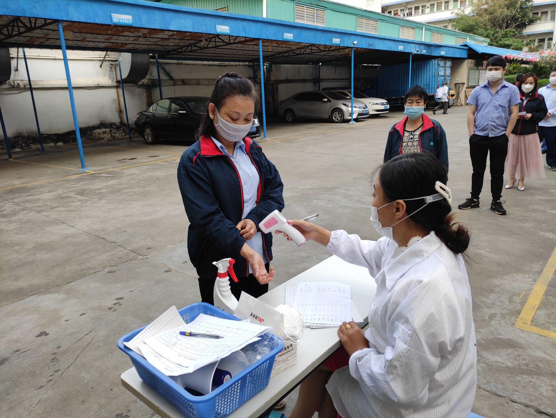 ▲每天早上盧經(jīng)理給每位上崗人員量測(cè)體溫