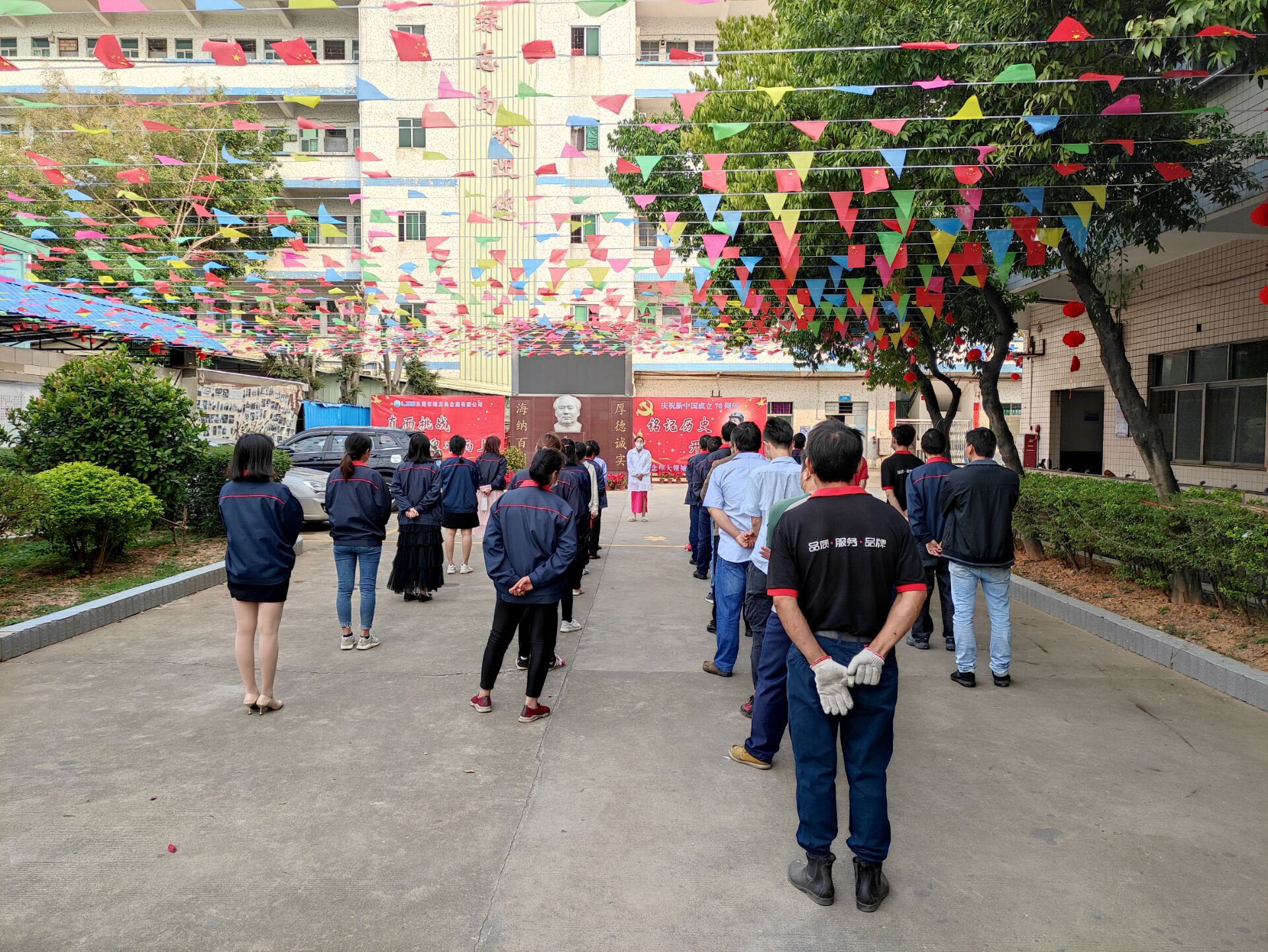 ▲周一早會(huì)盧經(jīng)理在室外給上崗人員宣導(dǎo)防疫知識(shí)